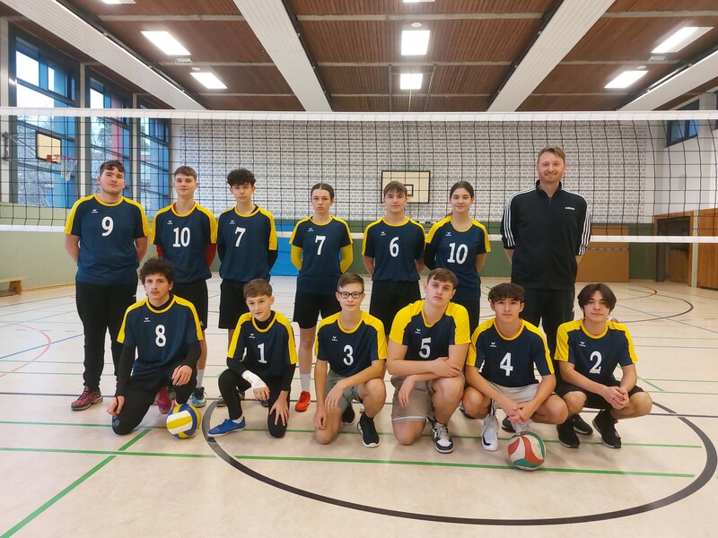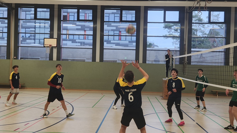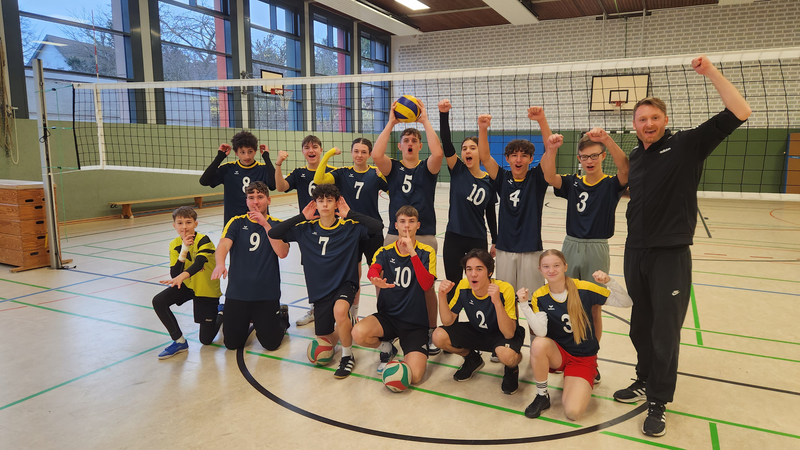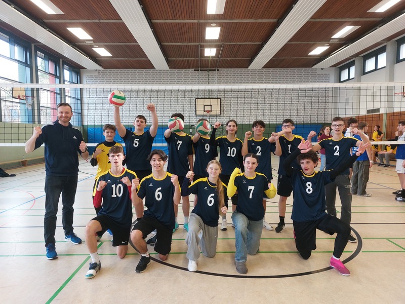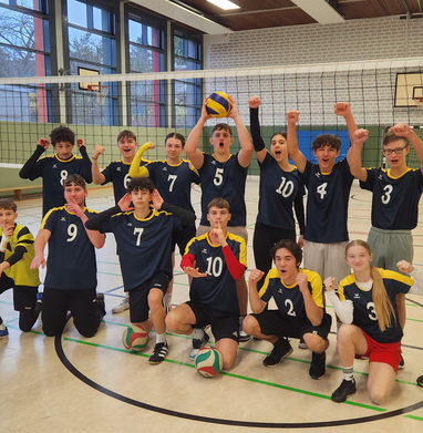 Die Volleyball-AG um Herrn Blumenthal spielte heute als Kreissieger des Rhein-Erft-Kreises gegen die Sieger aus Düren und Euskirchen. Gegen die Anne-Frank Gesamtschule Düren konnte wir in einen spektakulären Spiel 2:1 gewinnen. Die erste Niederlage der Saison war dann gegen einen Sport-LK aus dem Gymnasium St. Michael Bad Münstereifel. Gegen die Eifeler verloren wir 0:2, schnupperten aber fast an einem Satzgewinn. Glückwunsch an den starken Turniersieger St. Michael!